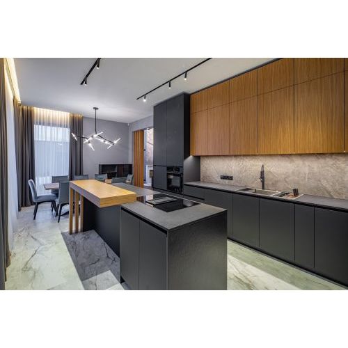 Для открывания фасадов используются ручка профиль установленная непосредственно в корпусе мебели. Для изготовления корпуса используется ЛДСП брендов Увадрев, Egger, Kronospan для изготовления фасадов МДФ толщина 16мм, 18мм., Alvic, Arpa HPL, TSS CLEAF (основа ЛДСП), фурнитура брендов BLUM (Австрия), Hettich (Германия), BOYARD (Китай), PULSE (Россия). Пластиковые столешницы российского производства ПластДекор, Союз, и Egger. По желанию заказчика гарнитур может быть укомплектован столешницей из искусственного камня, или кварцевого агломерата.